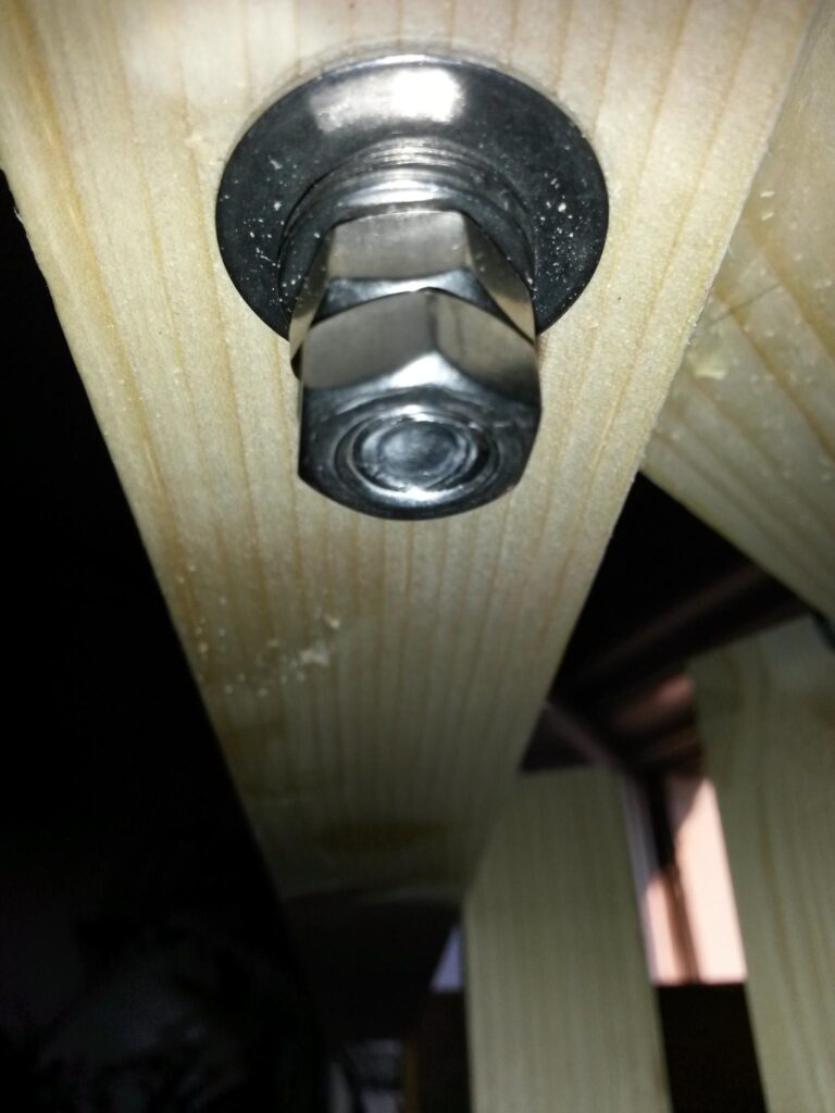 Deux rondelles ondulée prises en sandwich contre deux rondelle normales. Cela fait office de ressort qui maintient une pression malgré les dilatations/contractions du bois. Il est aussi possible de mettre un deuxième écrou qui bloque le premier.